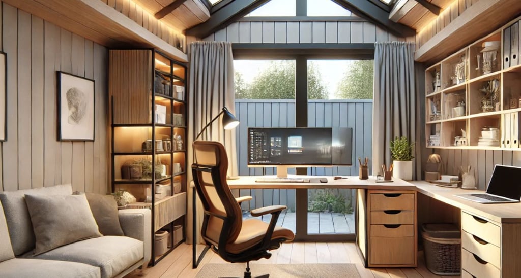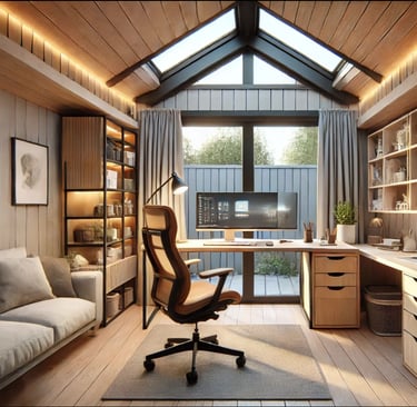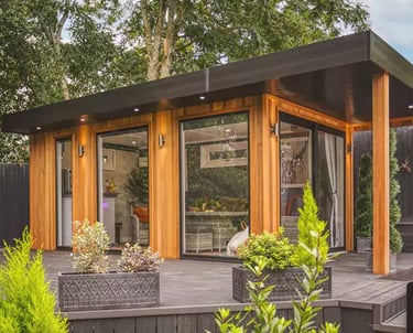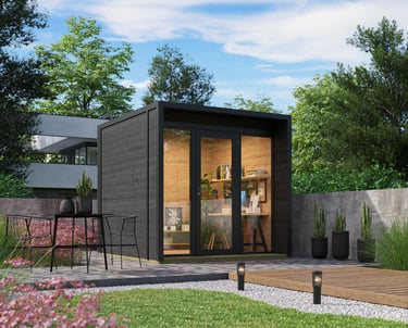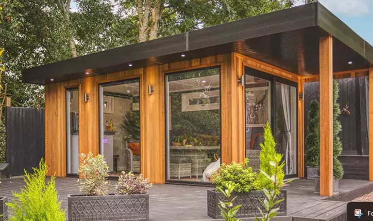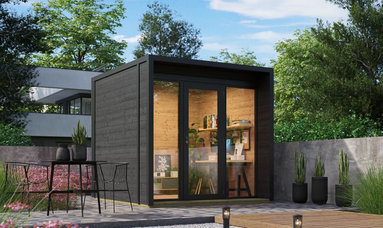 A cozy modern garden office cabin surrounded by lush greenery on a sunny day.